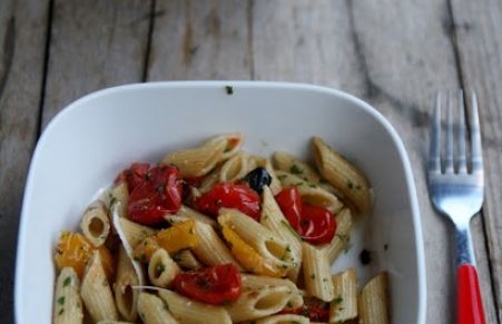 Insalata di pasta integrale con peperoni, pomodorini confit, olive nere e pesto di prezzemolo