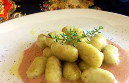 Gnocchi di Patate Rosse e Melanzane su fonduta di Camembert al Bordeaux