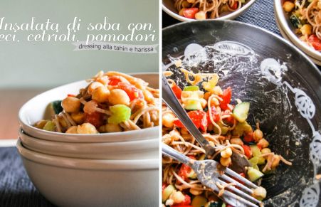 Insalata di soba con ceci, cetrioli, pomodori e dressing alla tahin e harissa