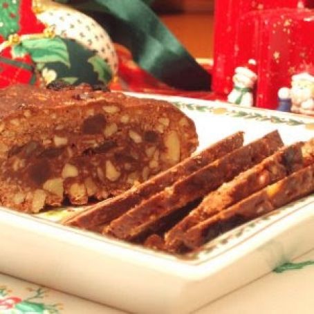 Sminuzzare noci, mandorle, nocciole e il cioccolato; a questo punto mescolare ed aggiungere i canditi, l'uvetta e le spezie (noce moscata e pepe nero).