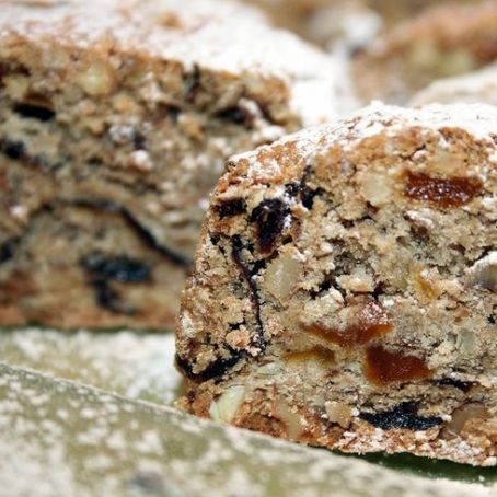 Sbattere le uova con lo zucchero fino ad ottenere un composto spumoso. In seguito aggiungere la frutta secca,un cucchiaio di cannella, 2 noci moscate grattugiate, scorza e succo di un limone, 2 cucchiai di rum, ed infine la farina.