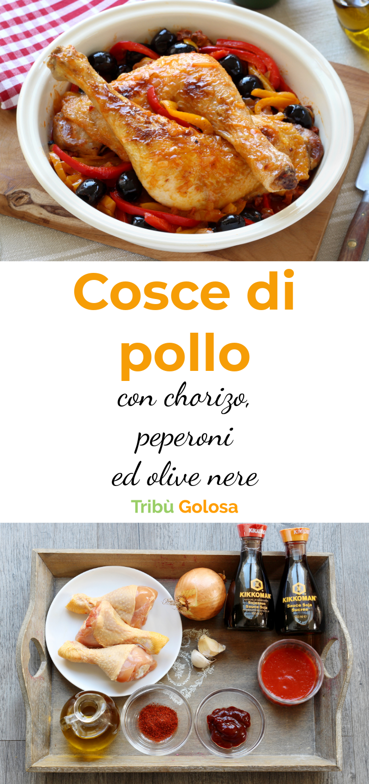Cosce di pollo in letto di chorizo, peperoni ed olive nere