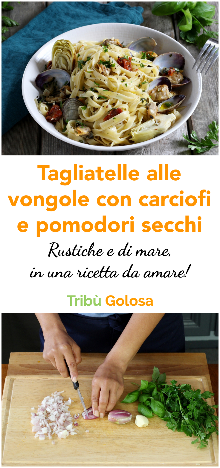 Insuperabili tagliatelle ricche di vongole, carciofi e pomodori secchi