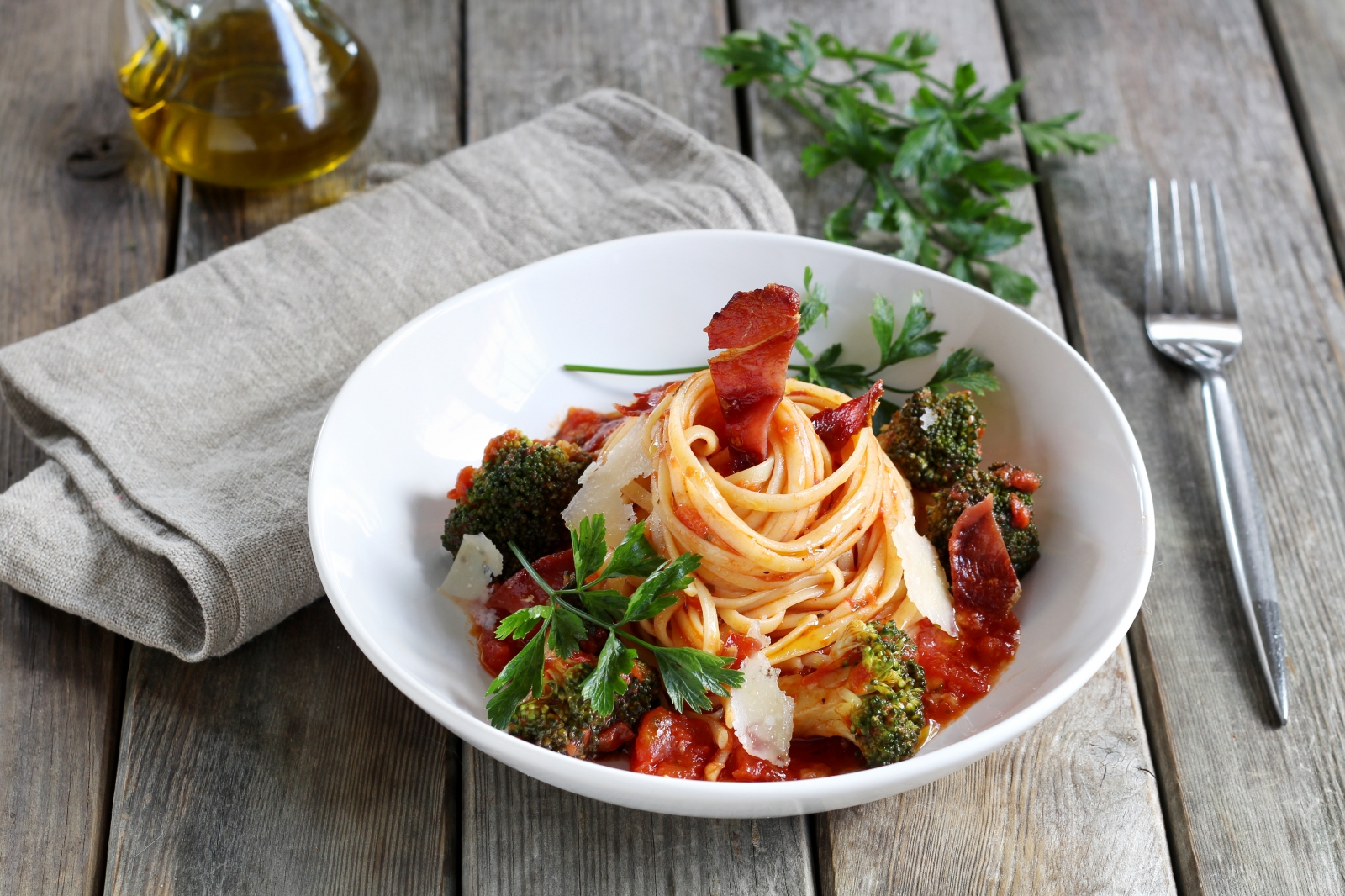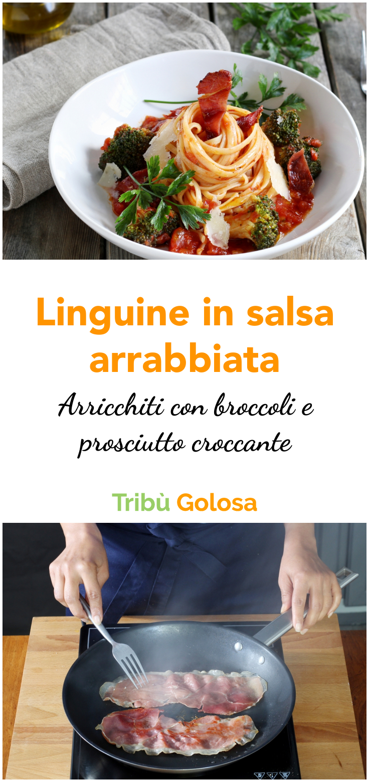 Linguine in salsa arrabbiata, broccoli e prosciutto croccante