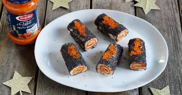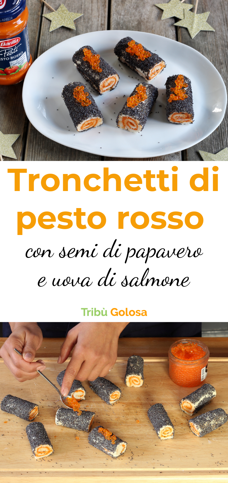 Tronchetti di pesto rosso con semi di papavero e uova di salmone