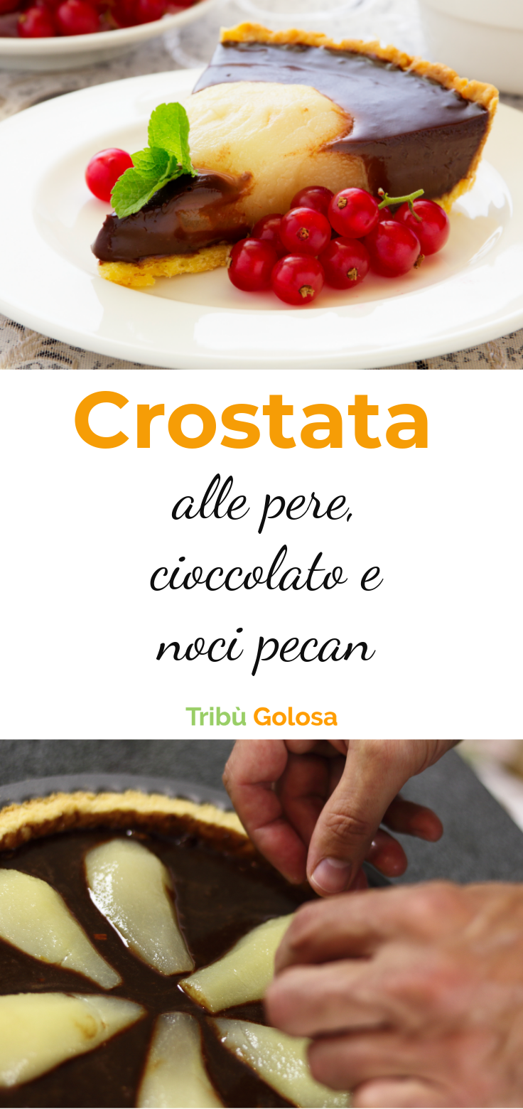 Questa crostata è il non plus ultra della golosità: un guscio di pasta frolla che racchiude un ripieno di cioccolato, pere e noci pecan; super golosa e buonissima: l'accoppiata pere e cioccolato viene sublimata dalla presenza delle noci pecan croccanti. Una crostata da non lasciarsi sfuggire!