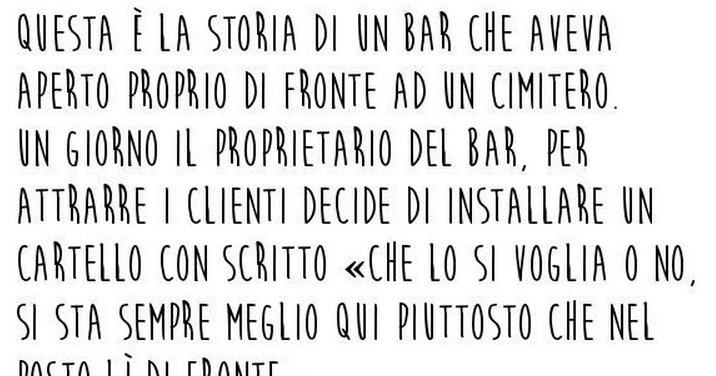 Il bar di fronte al cimitero Redattore Tribù Golosa, 12/03/2015 Tribù Golosa 185 condivisioni Condividi su Facebook Twitta Pin it Share on WhatsApp Condividi su G+ Scopri gli altri articoli della Tribù! la minestra di verdure I giovani sposi Un marito geloso Commenta questo articolo