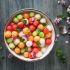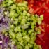 Tagliate i pomodorini a metà, affettate la cipolla di Tropea molto sottile. Tagliate i peperoni a filetti.