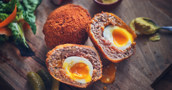 Non è necessario prendere un aereo per gustarsi questo classico della cucina UK, servito in tutti i pub e ristoranti del Regno Unito. Le Scotch Eggs (o Uova Scozzesi) sono facili da preparare in casa e sono ottime come antipasto o come spuntino. Come molti piatti famosi, la storia di queste uova non è chiara, possiamo però individuare la sua origine al 1800, ma ci sono disaccordi sul fatto che possa essere una ricetta londinese e non scozzese. Di certo questo piatto er adorato dai soldati scozzesi, forse è per questo che sono oggi famose come "uova scozzesi"!