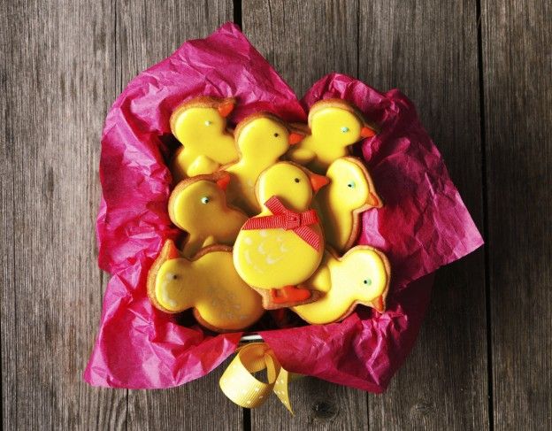 Un' ottima idea quella di realizzare dei biscotti a forma di animaletti in tema con la Pasqua. Noi abbiamo scelto i pulcini, ma potete dare libero sfogo alla vostra fantasia e fare dei coniglietti, oppure delle campane, e chi più ne ha più ne metta. Cominciamo facendo la frolla, mescolando cioè 75 gr di burro fuso con 60 di zucchero semolato, più un uovo. Mescolare bene, poi aggiungere 125 gr di farina, un pizzico di sale e due di cannella. Stendere l'impasto e con degli stampini a forma di pulcino, ricavare i biscotti. Infornare in forno preriscaldato a 180° per 15 minuti. Per la glassa, basta mescolare lo zucchero a velo con del succo di limone e del colorante commestibile. Disporli sulla tavola già imbandita ;)