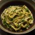 Tagliare 1 broccolo a cimette e farlo cuocere in acqua bollente. Quando è quasi cotto, ma ancora croccante, scolatelo e mettetelo a bagno in una ciotola con acqua fredda e dei cubetti di ghiaccio. Questa operazione serve a mantenere il colore verde brillante al broccolo. Far soffriggere l'aglio tritato in una padella con dell'olio caldo, unire la panna, mescolare bene, aggiungere la buccia di limone grattugiata, salate, pepate. Date una mescolata ed unite il succo di limone.