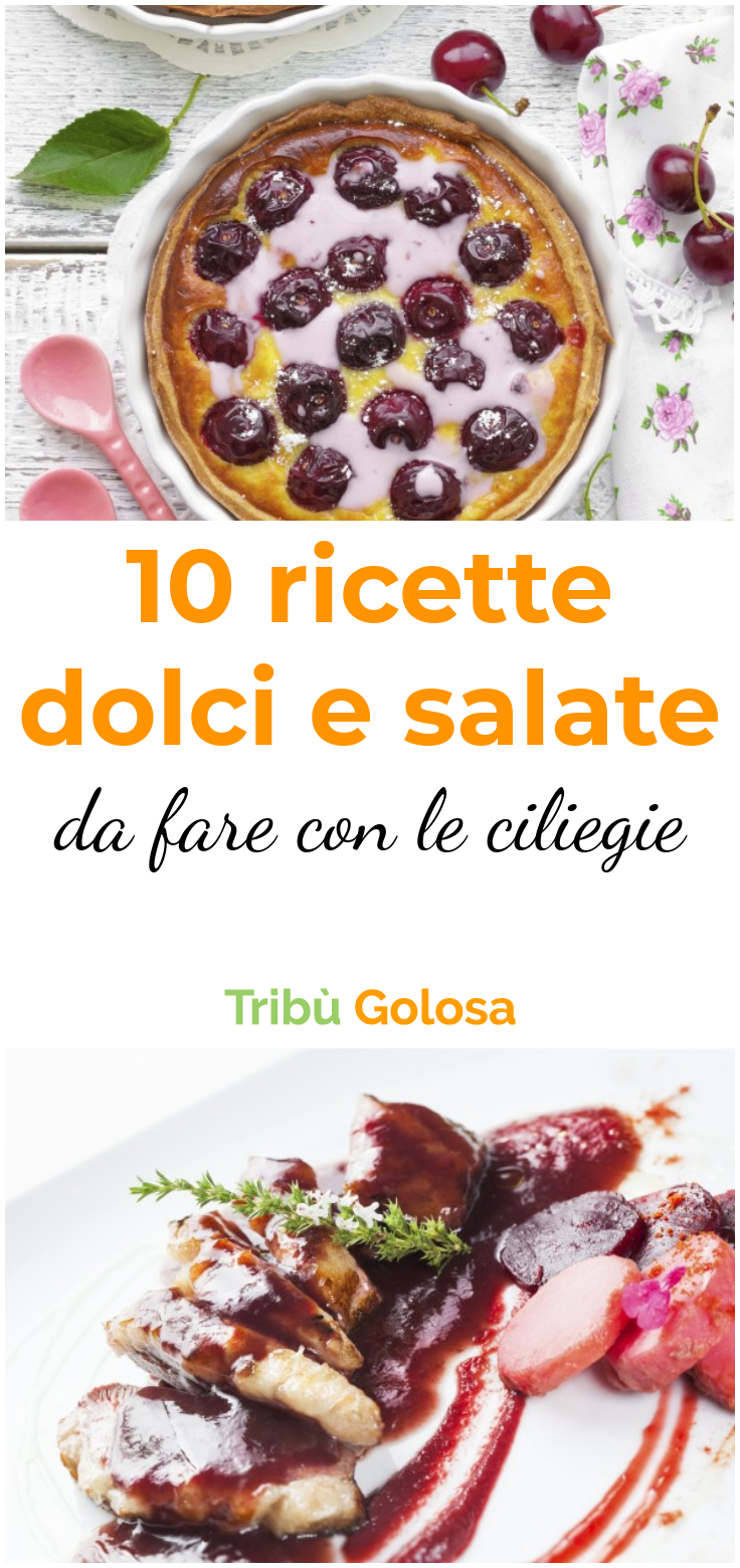 La ciliegia è un frutto gustoso e tenero. E' ricca di zucchero e fonte di fibre, piena di vitamina C e vitamina B. Le ciliegie sono raccolte da giugno ad agosto secondo la specie. Tutti adorano le ciliegie, sia al naturale che nelle ricette dolci. Forse non avreste mai immaginato che le ciliegie si prestano bene anche per le ricette salate. Vediamo 10 ricette dolci e salate da fare con le ciliegie.
