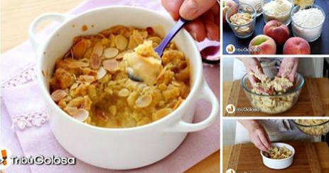Fate sciogliere in un pentolino 20 g di burro. Versate una mela tagliata a cubetti e, a piacere, un cucchiaino di cannella. Aggiungete anche 20 g di zucchero, mescolate e unite il succo di mezzo limone. Una volta che le mele saranno caramellate, toglietele dal fuoco. A parte, in una ciotola, mescolate 40 g di farina con 20 g di zucchero e 30 g di burro morbido. Lavorate l'impasto con la punta delle dita fino ad ottenere un composto sbriciolato. Fate cuocere il vostro crumble in un pentolino antiaderente e, quando sarà dorato, versatelo sulle mele.