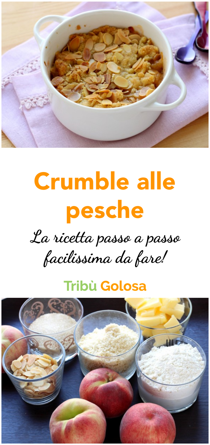 Il crumble alle pesche è il dessert conviviale da condividere in famiglia, che puo' essere preparato anche con altri tipi di frutta.