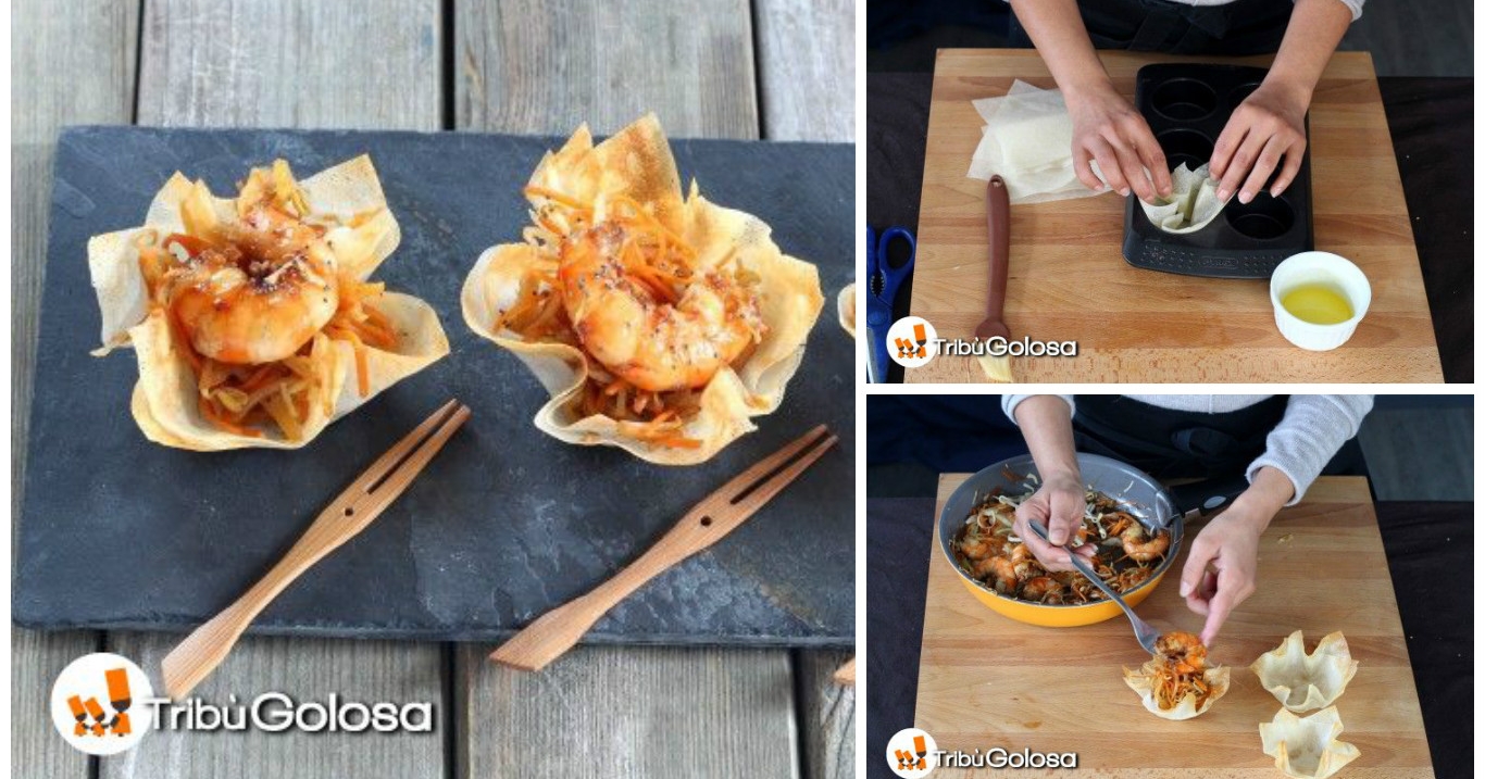 Stufi di portare in tavola sempre il solito antipasto? Stupite i vostri ospiti con questi deliziosi cestini di gamberi dal gusto orientale!