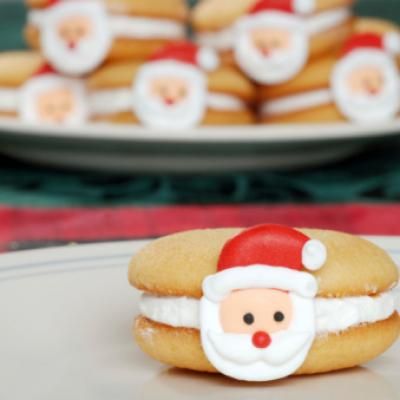 Originari della Pensilvania questi dolci sono ancora poco conosciuti ma sono già stati demoninati i cugini dei macarons per la loro forma tondeggiante e la farcia nel mezzo di due biscottini. Decorati in mille modi, gli whoopies possono diventare anche dolci natalizi grazie alla decorazione nella foto qui sotto.