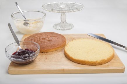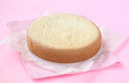 Se il vostro pan di Spagna è completamente freddo, significa che è pronto per essere tagliato! L'ideale è utilizzare un taglia-torte regolabile in acciaio, ma se non lo avete potete utilizzare in alternativa un coltello lungo seghettato o un filo da cucina.