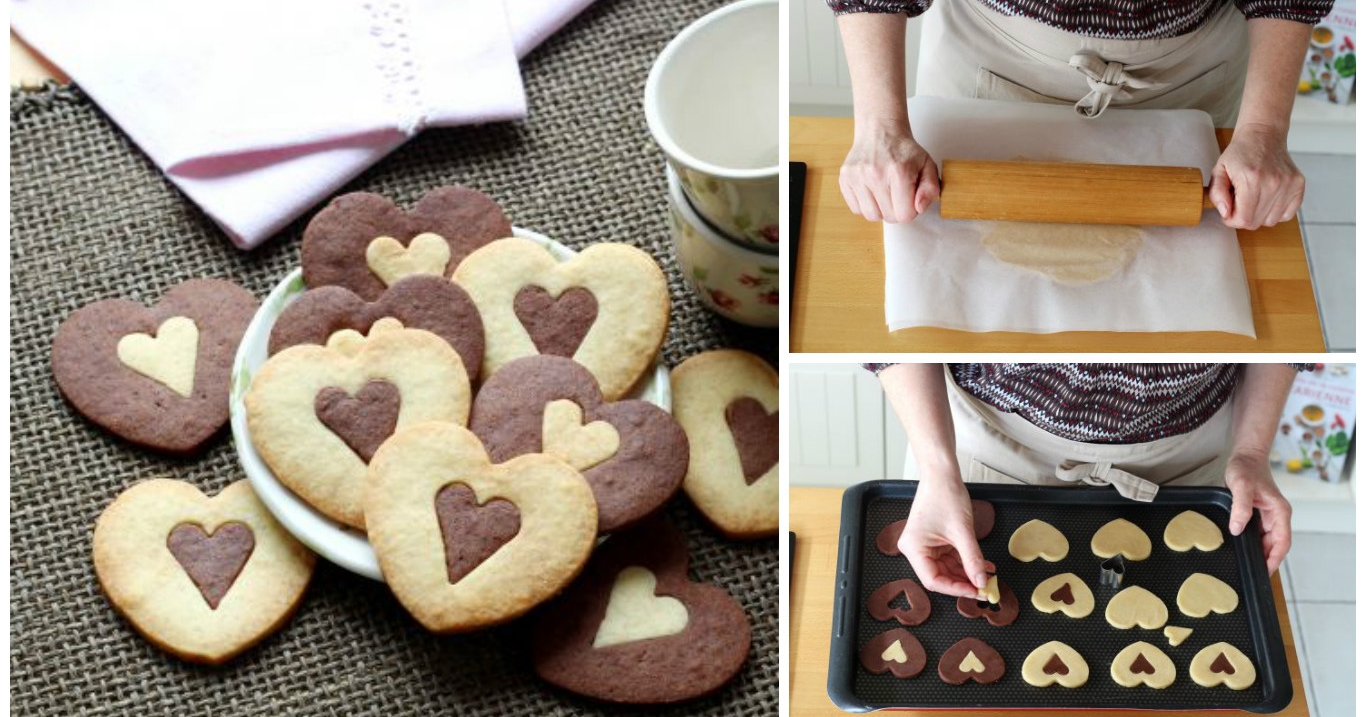 Ecco dei romantici biscotti bicolori a forma di cuore, ideali per un regalo originale per San Valentino, ma anche da accompagnare al tè del pomeriggio.