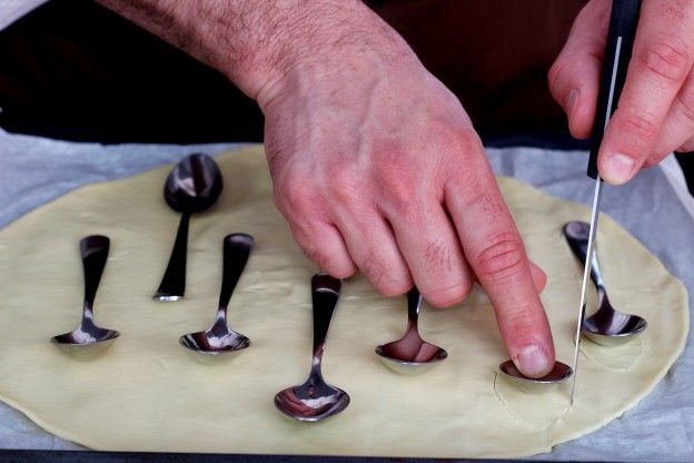 Srotolare la pasta sfoglia sul piano di lavoro, lasciando sotto la carta forno. Poggiare 12 cucchiaini sulla pasta, lasciando dello spazio tra l'uno e l'altro.