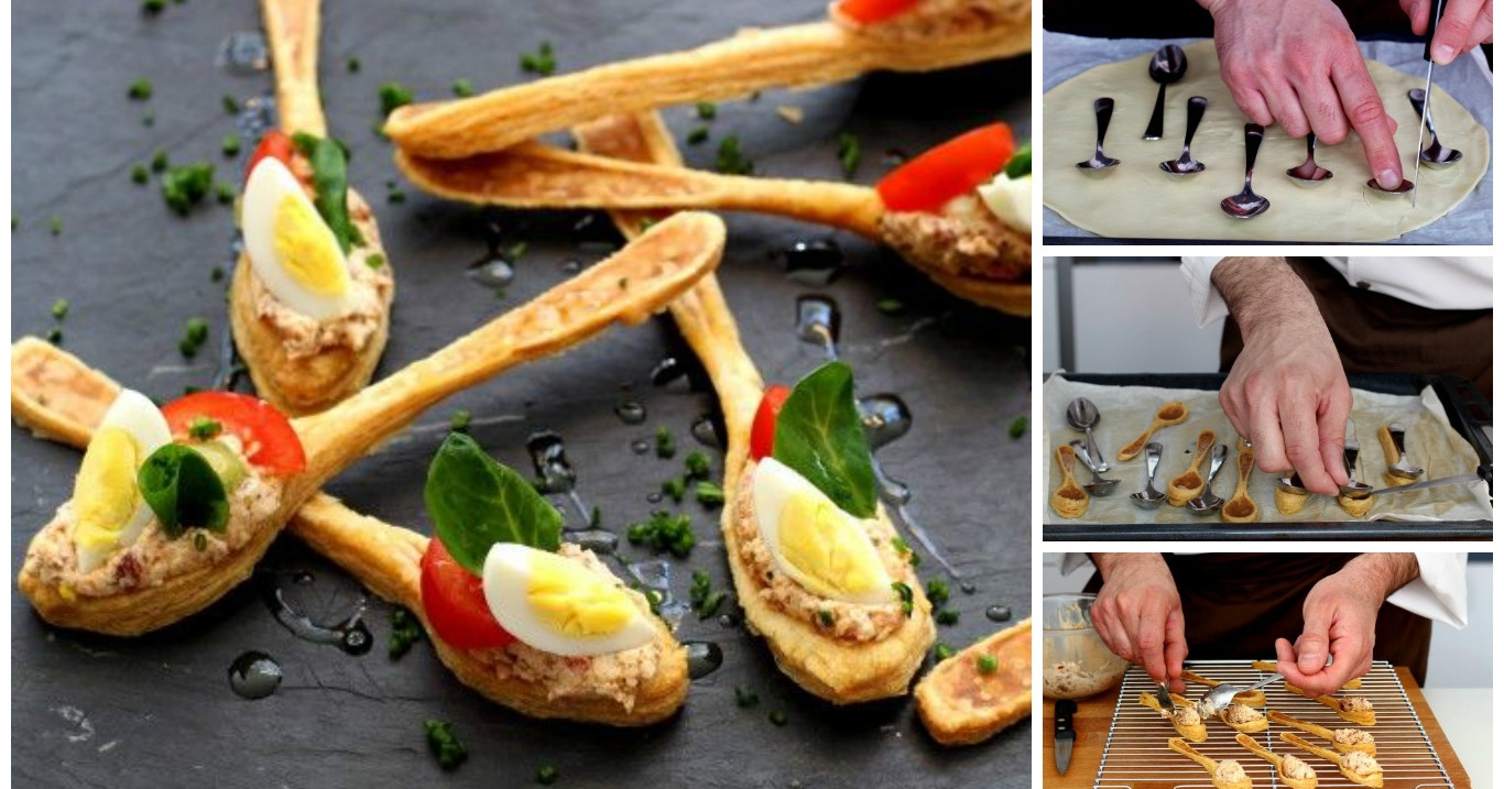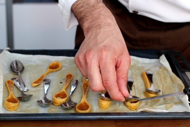 Con un coltello, tagliare la pasta sfoglia tutt'intorno ai cucchiaini. Eliminare la pasta in eccesso e lasciare solo quella sotto ai cucchiaini. Disporre i cucchiaini di pasta sfoglia, con il loro cucchiaino di inox poggiato sopra, su una teglia foderata di carta forno. Infornare a 180°C e farli cuocere per 10 minuti. Stendere con un mattarello la pasta ritirata al fine di ottenere degli altri cucchiaini. Lo Chef consiglia di non rimpastare la pasta formando una palla per non perdere la sfoglia: stendere quindi semplicemente la pasta con mattarello, senza re impastarla. Versare il formaggio spalmabile in un recipiente, aggiungervi i pomodori secchi tagliati a pezzettini e mescolare, tenere da parte.