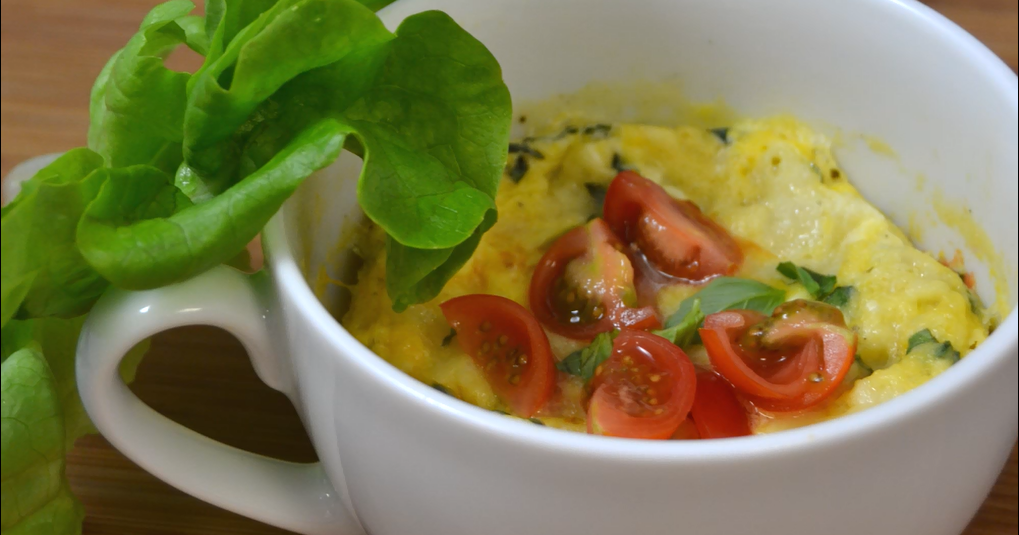 Mescolate in una tazza adatta al forno a microonde 2 uova con 2 cucchiai di latte, sale e pepe. Aggiungete del basilico fresco tritato, dei pomodori ciliegini tagliati a metà e 2 cucchiai di formaggio di capra o di mozzarella a dadini. Completate con un cucchiaio di parmigiano grattugiato e mettete in microonde per 2-3 minuti.
