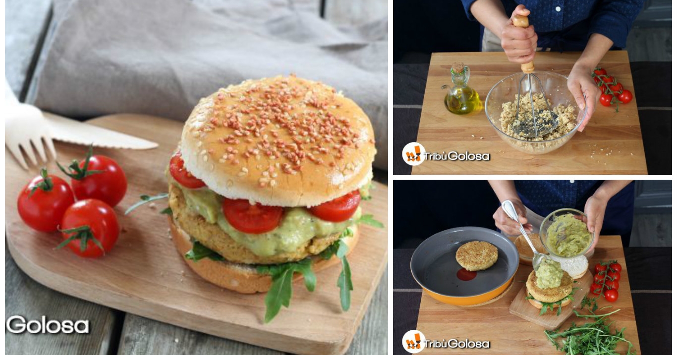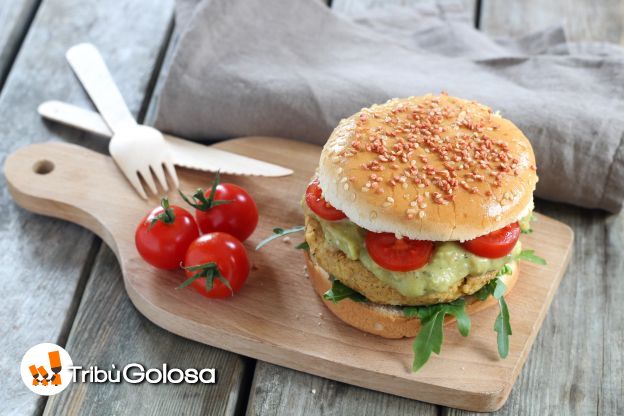 Una gustosa alternativa vegan al classico hamburger: burger di ceci, guacamole, pomodori e tofu affumicato. Una vera delizia!