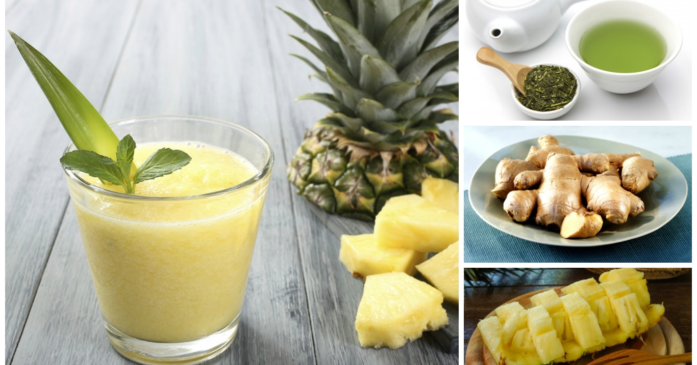 Estraete il succo di ananas tagliandolo a pezzi e mettendolo in una centrifuga. Fate bollire 500 ml di acqua e mettete dentro 2 bustine di tè verde, che lascerete in infusione per 5-6 minuti. Togliete le bustine e lasciate raffreddare il tè. Grattugiate la radice di zenzero ed unitela al tè, poi mescolate bene. Unite anche il succo di ananas, e se volete potete dolcificare con un cucchiaino di zucchero. Bevete questa bevanda durante la giornata: potete portarla al lavoro semplicemente mettendola in una bottiglietta di plastica. Potete mettere la bevanda in frigo per qualche ora, ma non di più; consumatela in giornata, per assicurarvi che non perda tutti i nutrienti.