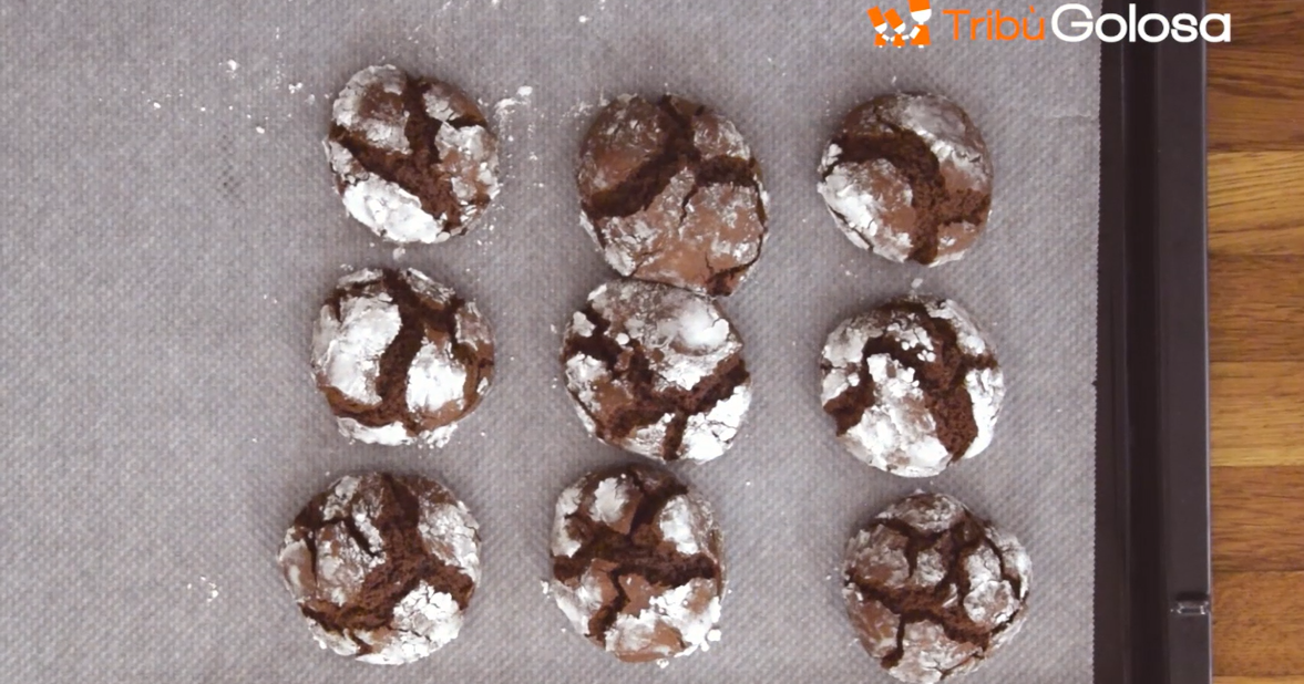 Fate fondere 200 g di cioccolato fondente con 75 g di burro. In un'altra ciotola, sbattete 2 uova intere con 110 g di zucchero e unitevi il composto di cioccolato. Incorporate 250 g di farina setacciata, 1/2 bustina di vanillina, 1/2 cucchiaino di lievito per dolci e un pizzico di sale. Lasciate riposare l'impasto in frigorifero per un'ora. Formate poi delle palline, passatele in un po' di zucchero a velo e trasferitele su una teglia ricoperta di carta da forno, quindi infornate a 180°C per 12-15 minuti. Una volta usciti dal forno, lasciateli raffreddare e cospargeteli di zucchero a velo.