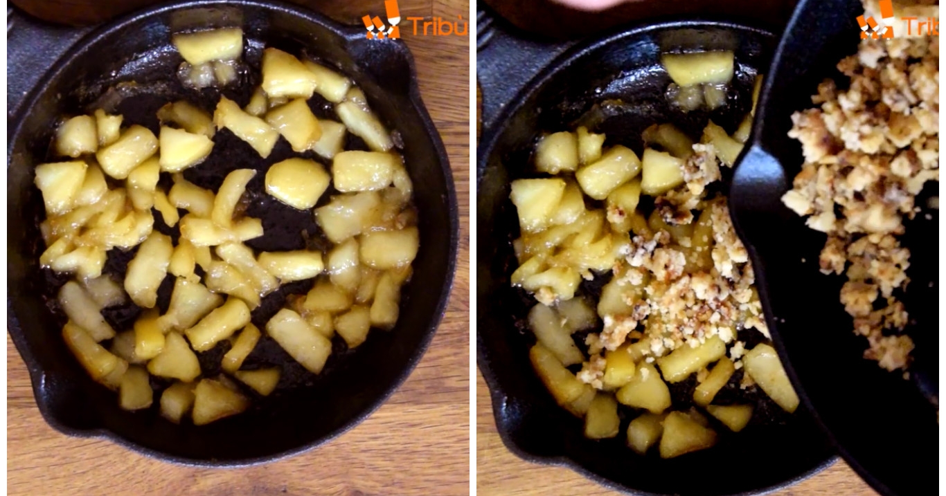 Fate sciogliere in un pentolino 20 g di burro. Versate una mela tagliata a cubetti e, a piacere, un cucchiaino di cannella. Aggiungete anche 20 g di zucchero, mescolate e unite il succo di mezzo limone. Una volta che le mele saranno caramellate, toglietele dal fuoco. A parte, in una ciotola, mescolate 40 g di farina con 20 g di zucchero e 30 g di burro morbido. Lavorate l'impasto con la punta delle dita fino ad ottenere un composto sbriciolato. Fate cuocere il vostro crumble in un pentolino antiaderente e, quando sarà dorato, versatelo sulle mele.