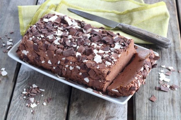 Sbriciolate grossolanamente i biscotti in una ciotola capiente e mettete da parte. In un'altra ciotola, mescolate bene lo yogurt con la robiola, lo zucchero e vaniglia. Fate fondere il cioccolato a bagnomaria e incorporatelo alla crema aiutandovi con una frusta. Aggiungete anche i biscotti sbriciolati. Mescolate delicatamente. Tenete i fogli di gelatina a mollo in una bacinella d'acqua fredda per qualche minuto. Riscaldate il latte e unitevi la gelatina ammorbidita e strizzata per farla fondere. Unite il latte e la gelatina al resto della preparazione. Montate la panna con delle fruste elettriche. Incorporatela delicatamente agli altri ingredienti, aiutandovi con una spatola. Imburrate o ricoprite di pellicola trasparente uno stampo a vostra scelta e versatevi l'impasto. Trasferite in frigorifero per almeno 4 ore. Sformate la mattonella su un piatto da portata e spolverizzate la superficie del dolce con le scaglie di cioccolato.