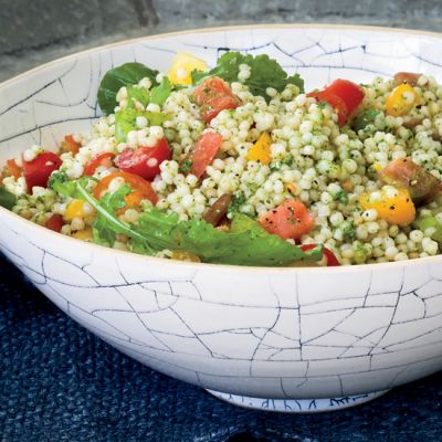Per chi si lascia sedurre dalla cucina etnica, una fresca insalata a base di ptitim (couscous israeliano. Ndr) e pomodorini pachino con pesto alla rucola, per un piatto semplice e gustoso da proporre durante una cena conviviale tra amici o perfetto per un dejeuner sur l’herbe rivisitato.