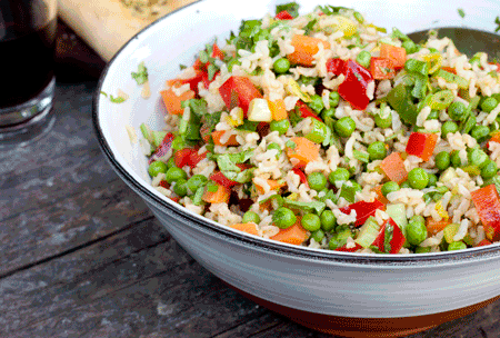 Per coloro che non possono rinunciare alla semplicità dei piatti nostrani, una freschissima insalata di riso primavera condita con un misto di verdurine (pisellini, carote, peperoni) e avocado, da arricchire eventualmente con prosciutto, pollo o tonno a piacimento.