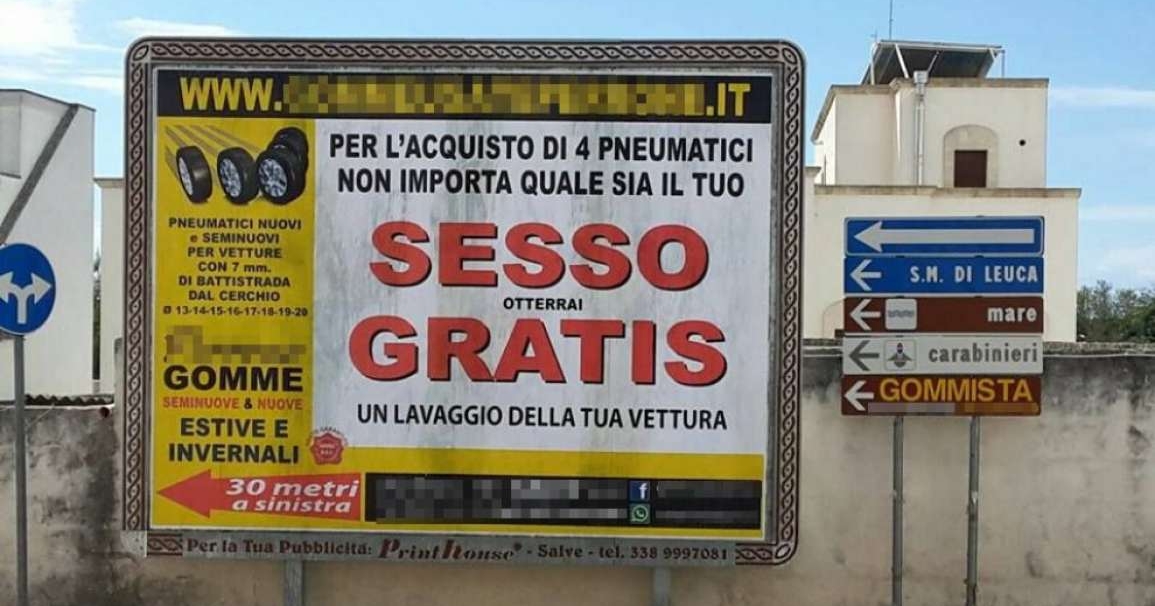 ‘SESSO GRATIS' è intervallato da "otterrai" e dalla spiegazione finale relativa la fatto che di gartis ci sarà un lavaggio dell'auto per chi acquista 4 pneumatici.