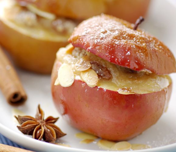 Preriscaldate il forno a 180°. Tagliate la mela a fettine fine. Mescolate in una ciotola l'uvetta, la farina di mandorle, lo zucchero di canna, la farina e la cannella. Stendete il rotolo di pasta sfoglia e aggiungeteci le mele al centro. Con un coltello appuntito, tagliate la pasta su ogni lato delle mele. Fate dei tagli sulla superficie, distanziati di 2 cm l'uno dall'altro. Iniziate ad intrecciare la pasta partendo dalle estremità e portandole verso il centro, accavallando le bande di pasta.