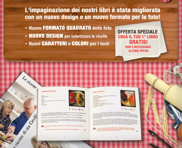 Grazie al successo del nostro servizio di self-publishing, abbiamo migliorato ulteriormente il design delle pagine interne del libro con una nuova impaginazione, un nuovo carattere per il testo e nuovi colori, per mermetterti di valorizzare al meglio le tue ricette.