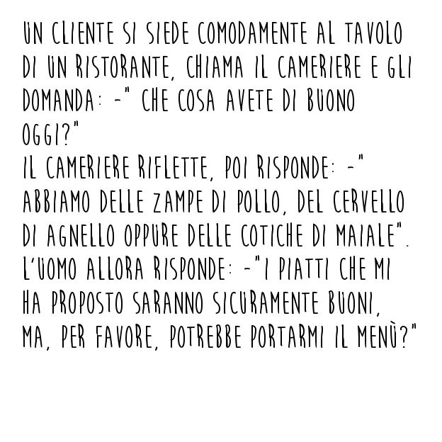 Al ristorante: dei piatti del giorno appetitosi Redattore Tribù Golosa, 19/11/2014 Tribù Golosa 22 condivisioni Condividi su Facebook Twitta Pin it Share on WhatsApp Condividi su G+ Scopri la barzelletta precedente! Scopri gli altri articoli della Tribù! Ex-fidanzati Nel frigorifero Cappuccetto rosso Commenta questo articolo