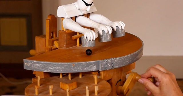 Si chiama Per Helldorf, l'artista artigiano svedese che ha realizzato quest'incredibile macchina automatica in legno che simula il gioco delle 3 palline e dei 3 bicchieri.