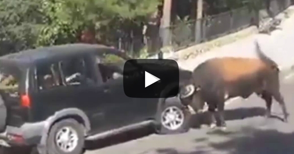 TORO SCATENATO incorna SUV, famiglia ILLESA