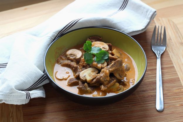 - 500 g di carne da spezzatino -30 g di burro - 1 cipolla finemente tritata - 100 g di funghi champignons freschi - 1 pizzico di zucchero - 1/2 cucchiaino di paprika - 1 cucchiaio di concentrato di pomodoro - 5 cl di vino bianco secco - 4 cucchiai di panna - 1 cucchiaio di senape - Sale e pepe