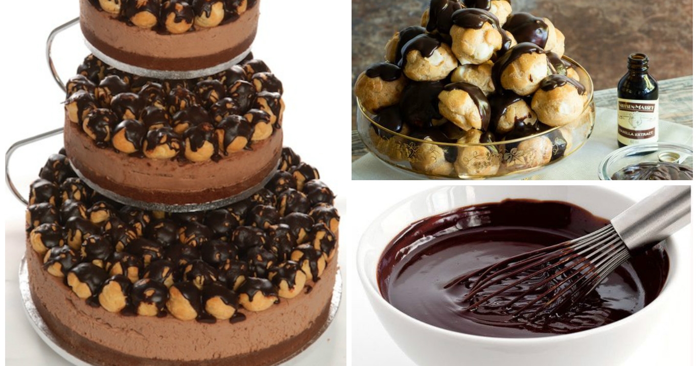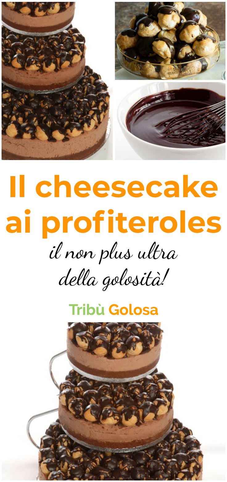 Un cheesecake sormontato da profiteroles farciti di panna e decorati con golosa glassa al cioccolato: riuscite ad immaginare un dessert più goloso?