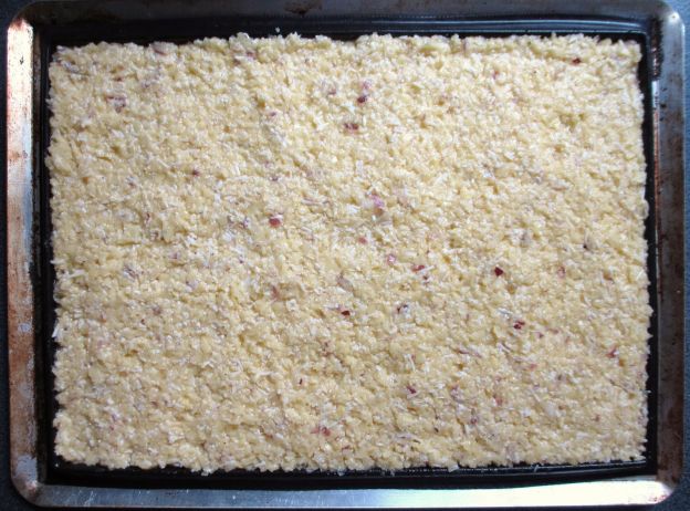 Una volta cotte, riunire la metà delle fettine di patate formando una sorta di rosa, sempre tenendole sulla placca del forno. Unire il formaggio grattugiato ed il prosciutto crudo. spezzettato. Ricoprire di fettine di patate e di formaggio e ripetere l'operazione 2 volte.