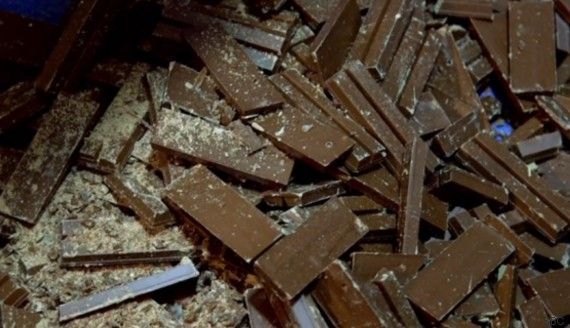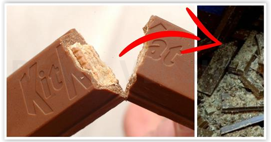 Insomma, l'interno di un Kit Kat è fatto di...altri Kit Kat! ("Aspetta un attimo...come?!). Lascia che mi spieghi meglio: ogni Kit Kat è ripieno di altri Kit Kat danneggiati durante il processo di produzione! I sacchetti vengono aperti e tritati, quindi utilizzati come ripieno, di modo che l'interno del famoso cioccolatino è esattamente uguale all'esterno.