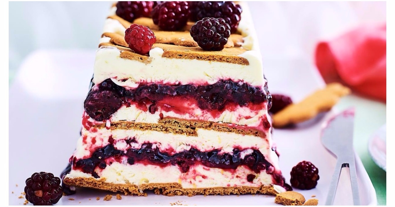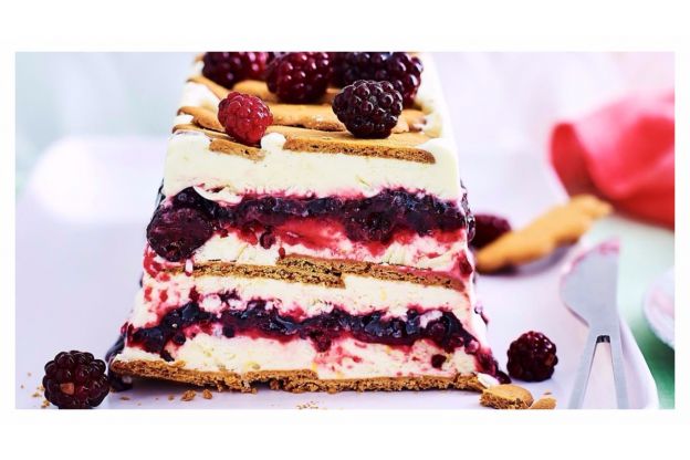 Frullate la frutta, mettendone da parte per decorare, zuccherate un po' e decorate, quindi mettete in frigorifero. Mettete sul fondo di una teglia di vetro uno strato di biscotti e bagnateli con un po' di succo di frutta; stendete uno strato di yogurt e cospargete con la frutta. Procedete con altri biscotti, yogurt e completate con la frutta rimasta, creando una decorazione. Mettete in frigorifero a riposare per almeno 3 ore.