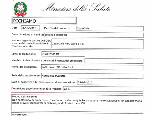 Il Ministero della Salute ha recentemente comunicato che è in corso un importante ritiro di bottiglie di Coca-Cola da 1.5L appartenenti al lotto L170329863M.