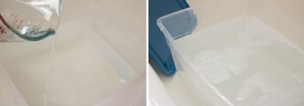 Getta ora nella vasca la miscela e ripassa i giocattoli con acqua pulita per rimuovere i residui di sapone.