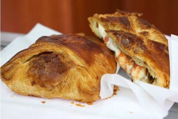 Sbucciate la cipolla, tagliatela a fettine sottili e fatela cuocere a fuoco medio in padella con 3 cucchiai di olio extravergine. Quando inizia ad imbiondire versate un goccio d'acqua, la passata di pomodoro, ed unite sale e pepe, quindi continuate la cottura fino a che la cipolla sarà morbida. Ora sbattete l'uovo in una ciotola con il latte ed un po' di sale. Stendete la sfoglia e formate dei quadrati: in ognuno di essi mettete un po' di cipolla, una fetta di mozzarella ed il prosciutto. Ora chiudete i fagottini ripiegando gli angoli e sigillando bene. Mettete le cipolline su una teglia ricoperta di carta forno e spennellate con il latte e l'uovo. Fate cuocere per 30 minuti a 200°, spennellando di nuovo le cipolline a metà cottura.