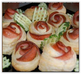 Stendete la pasta sfoglia con il matterello e dividetela in strisce ; distribuite delle mezze lune di prosciutto mettendo la parte tonda più sporgente della pasta sfoglia. Arrotolate, appoggiate le rose su uno stampino da cupcakes e cuocete in forno a 180° per una ventina di minuti.