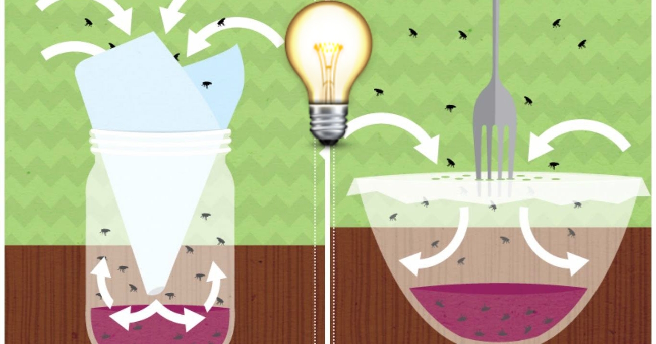 Riscalda l'aceto di mele e mettilo nel barattolo di vetro, aggiungendo la goccia di detersivo e la frutta. Copri con l'imbuto. I moscerini saranno attirati nel barattolo ma non sapranno più uscire.
