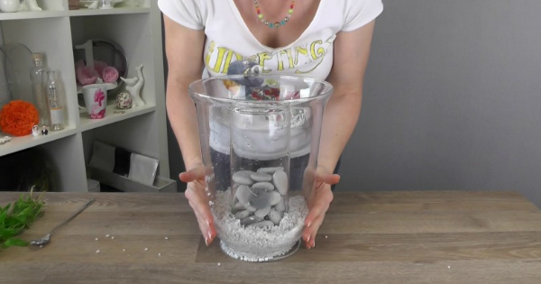 Mette un vaso dentro ad un altro vaso ed aggiunge dei sassi. È quando versa l'acqua che la magia inizia!