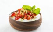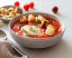 Versare la panna liquida e lo sciroppo di zucchero in una bottiglia di acciaio per montare la panna. Ricaricare con una bomboletta di gas. Tagliare a metà il melone, eliminare i semi e servendovi di uno scavino ricavare delle palline di melone.